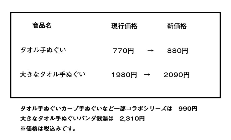 タオル手ぬぐいの価格改定につきまして